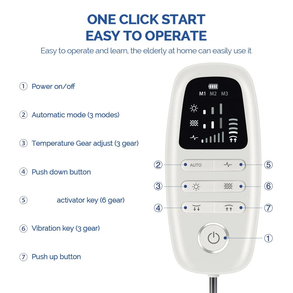 The device offers three customizable modes that adapt to your comfort and therapy needs. Modes 1 and 2 provide targeted up-and-down airbag movement combined with vibration to relieve deep lumbar tension. Mode 3 adds a left-and-right swing motion, delivering a more dynamic massage experience for full lower-back relaxation.